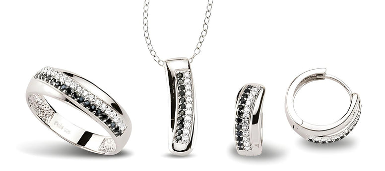 Elegantes Schmuckset aus 925er Silber mit Kette, Ring und Ohrringen. Besetzt mit funkelnden schwarzen und weissen Zirkonia-Steinen.