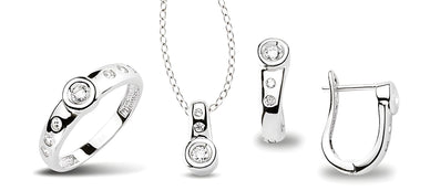 Elegantes Schmuckset aus 925er Silber mit Kette, Ring und Ohrringen. Besetzt mit weissen Zirkonia-Steinen.